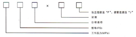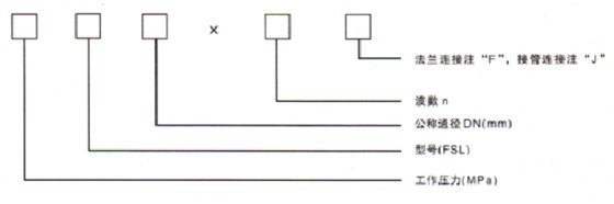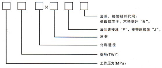 舉例:0.6TNY500TF 表示:公稱通徑為Φ500,工作壓力為0.6MPa,(6kg/cm2)波數為4個,帶導流筒,碳鋼法蘭連接的內壓式波紋補償器